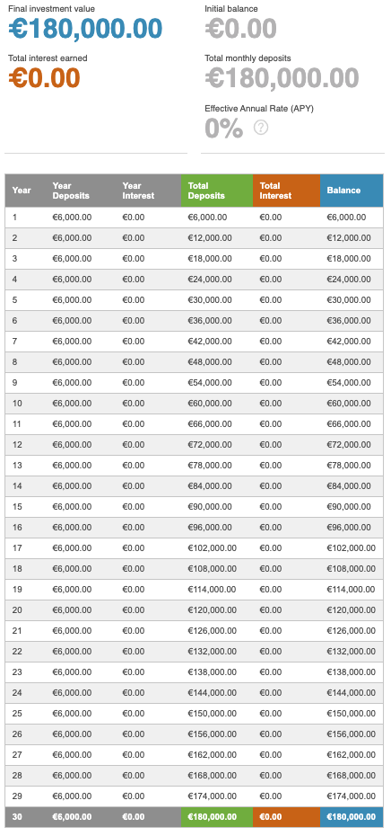 In beide scenario’s spaar je € 500 per maand. Echter doe je dit in scenario 1 op een normale bankrekening waar je geen rente ontvangt over je geld (zoals de meeste mensen sparen).