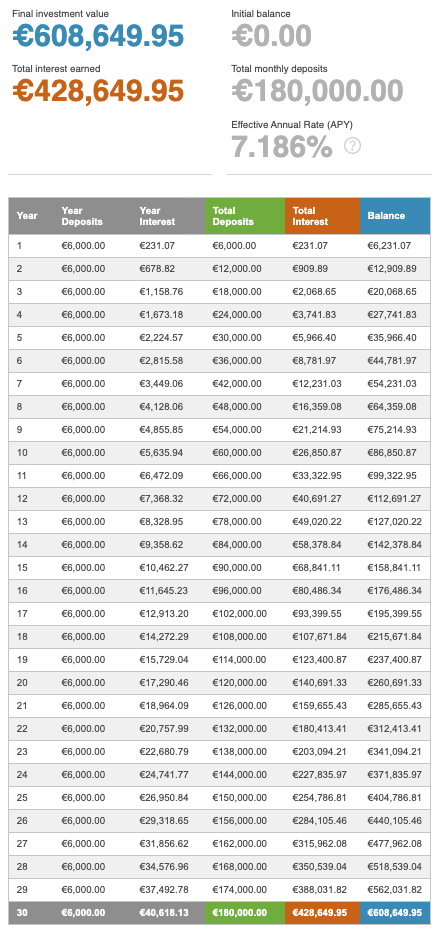 Rente op rente berekenen kun je doen met Excel, maar er zijn ook online tools die het effect van rente op rente goed weergeven. Een voorbeeld hiervan is de tool die ik voor de scenario’s heb gebruikt, thecalculatorsite.