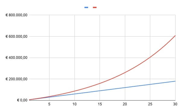 Met Compound Interest kun je rente op rente beleggen. De rente die je krijgt investeer je opnieuw en hierover ontvang je ook weer rente. Om het verschil aan te geven zal ik hieronder een voorbeeld neerzetten met twee manieren van sparen voor je oude dag.
